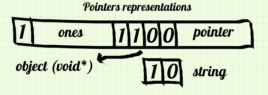 They create a wide spectrum of representations. Numbers can occupy 64 or 32 bits, null is just one special value and for booleans, we need two of them: true and false. Objects and strings have to be stored as pointers, as we do not know in advance their size. Moreover, the size of a pointer depends on the chip’s architecture. In most modern computers, they can have 32 or 64 bits.