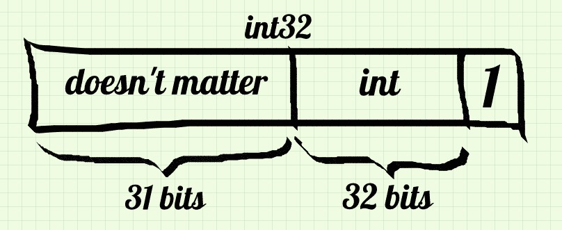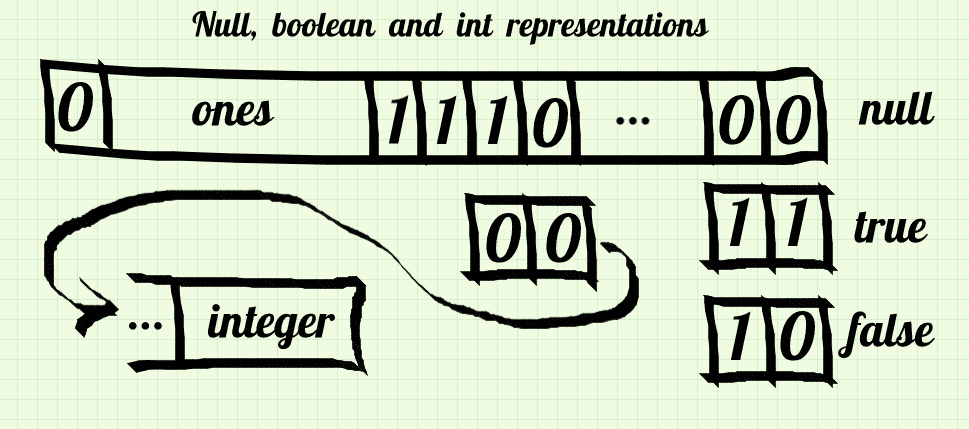 The time has come for null, booleans and integers. They will have a pretty straightforward representation. We are going to use the third bit of a fraction part and the last two bits. Third bit as 1 will mean “it is boolean or null”, as 0 “it is an integer”. The actual value will be encoded at the end of the fraction part, like this: