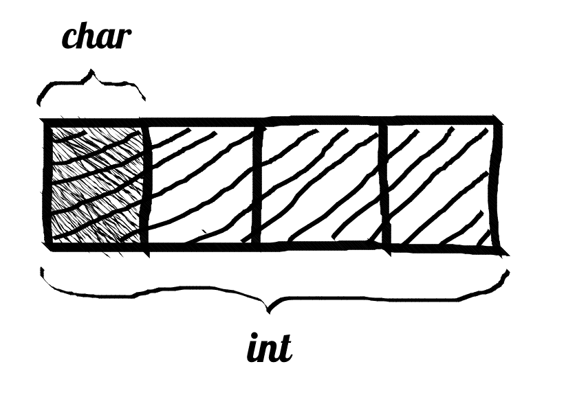 };We have 4 bytes for int and 1 byte for char. In memory, these two types overlap each other. In other words, these bytes can be interpreted as char or as int.
